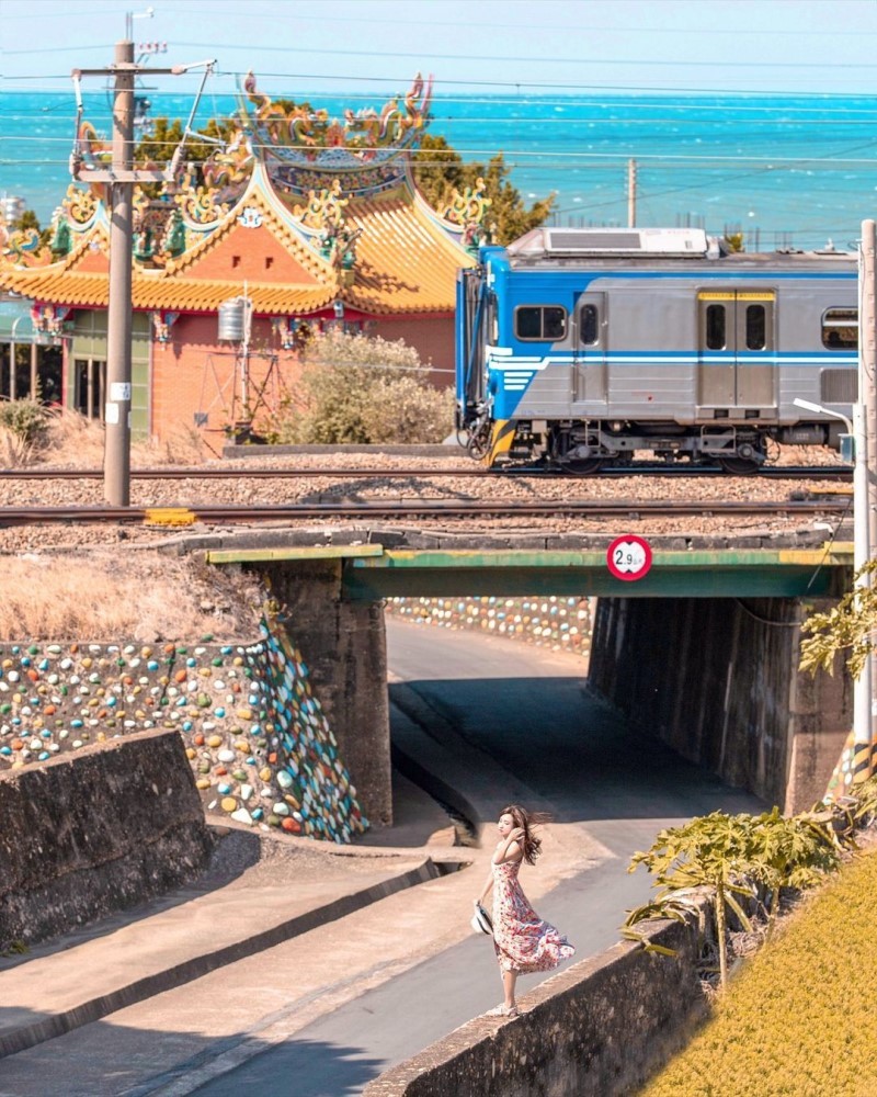 新收錄的拍攝秘境【白沙屯車站】地標,在火車奔馳的背景裡,有著白沙屯媽祖高聳神聖的廟宇,映著藍色與閃亮的海面,坐下來看眼前這畫面,感覺心靈平靜了許多。