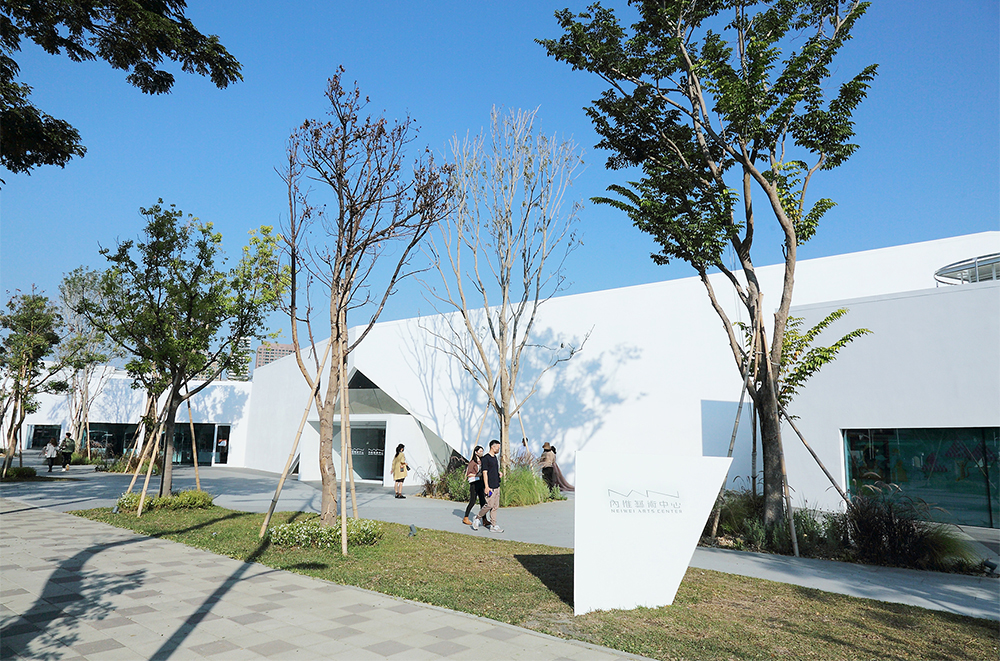 夜色來臨,白色的內惟藝術中心點起燈來,別有一番風情。營運至夜間9點,為下班下課後想沉澱心靈的人們,仍敞開歡迎的大門。