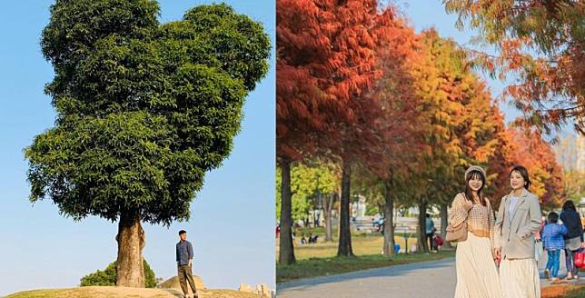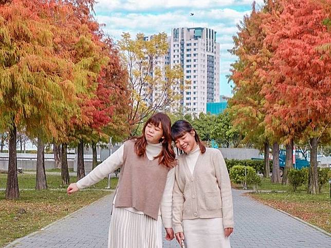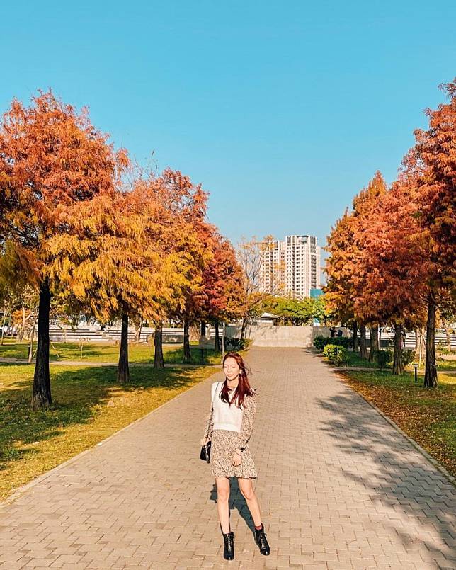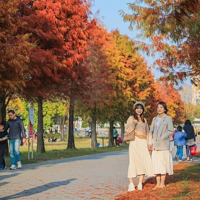台中除了后里的落羽松祕境外,位在北屯的萬坪公園也有浪漫的落羽松大道,筆直的步道兩旁種植一排落羽松林,在兩排併列整齊的落羽松大道拍起照來視覺無限延伸,走在火紅的落羽松大道上十分浪漫又悠閒。