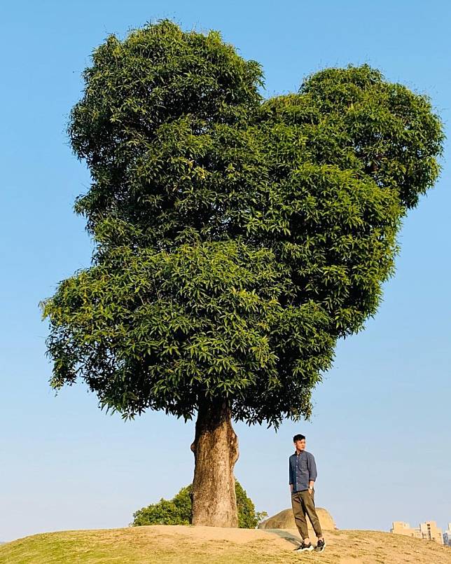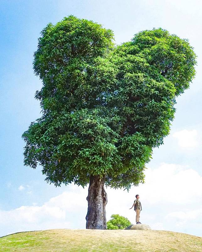 萬坪公園內的米奇樹其實是一顆百年芒果樹,樹上頂著兩球圓圓茂密的樹葉,像極了米奇造型的模樣,而且據說這顆米奇樹是自然生成,並沒有經過修剪,可愛的模樣引起許多民眾特地前來拍攝,獨特的造型遠遠看就超吸睛,再搭上大片綠草皮超級療癒。