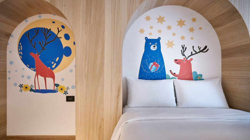 挪威森林行旅1號館就位在台中火車站正前方,不僅交通方便外牆的設計更是吸睛,童話故事般的建築是旅客到台中的第一印象,館內提供了親子設施,像是球池、玩具區和益智遊戲,還沒進房小朋友就對這遊戲區深深著迷,進房後更是一陣驚喜,超大幅的森林動物掛在天花板,躺在床上彷彿進入了叢林世界,是個裡外都兼具的親子飯店!