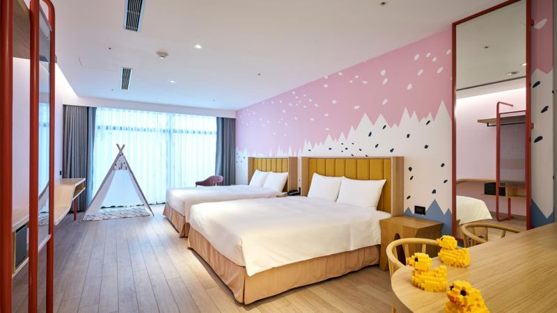 親子館則仿造小朋友的童趣時光,多種主題房型不僅精緻可愛又寬敞,每間房間皆附有兒童專屬車庫、電動小車和客房內獨立大浴池等設施,根本是另個度假天堂!
