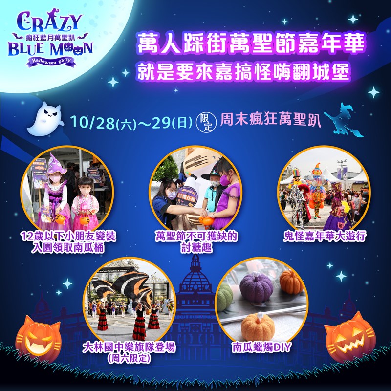 去年試營運時就造成熱烈迴響的佐登妮絲城堡將於9/29到11/5舉辦「城堡瘋狂藍月萬聖趴」!期間園內除了有萬聖節限定的打卡點和多種親子活動外,更會於10/28-29連續兩天上演萬人踩街萬聖節嘉年華,包含了經典「討糖趣」、精彩的樂旗隊表演與南瓜蠟燭DIY體驗項目,是適合親子旅遊、感受萬聖節氛圍的好去處。