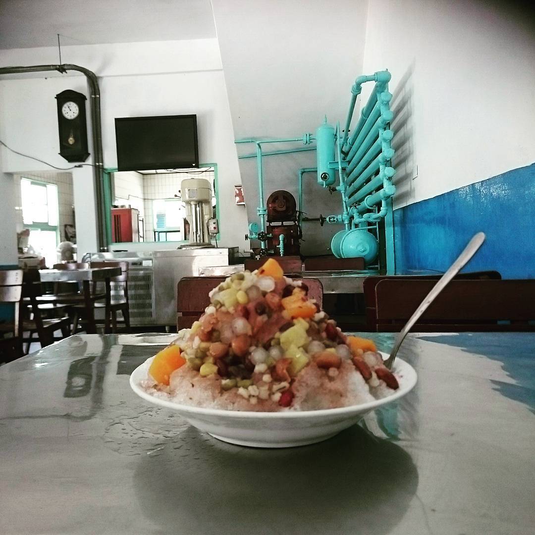 低調的小涼園冰果室,是夏日限定的美味,店門口沒有醒目招牌,灰色牆面上鑲嵌著藍綠色的窗台,像及了兒時放學後去的傳統冰果店。店裡的招牌是色彩鮮豔的「八寶牛奶冰」,,紅豆、綠豆、花豆、玉米、地瓜、麥角、鳳梨、QQ8種配料,口感有綿蜜、有硬脆、有Q彈,滋味豐富,最特別的是店內的牛奶冰用的並非鮮乳,而是利用全脂奶粉加糖水拌入剉冰中,讓整碗冰都融入牛奶的香味,冰的口感也因此變得更為細綿,是在外面吃不到的剉冰口感。