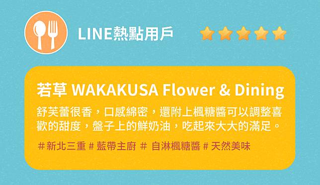 隱身在三重巷弄中的若草,店內的甜點師傅擁有藍帶甜點證照,主要提供鬆餅、蛋糕、飲料等甜點。其中,綿密細緻般如棉花糖口感的舒芙蕾是店內的熱門品項,搭配北海道頂級鮮奶油,店家還貼心的附上一瓶楓糖醬,讓你依照自己口味調整甜度,是大人小孩都會喜歡的精緻甜點!