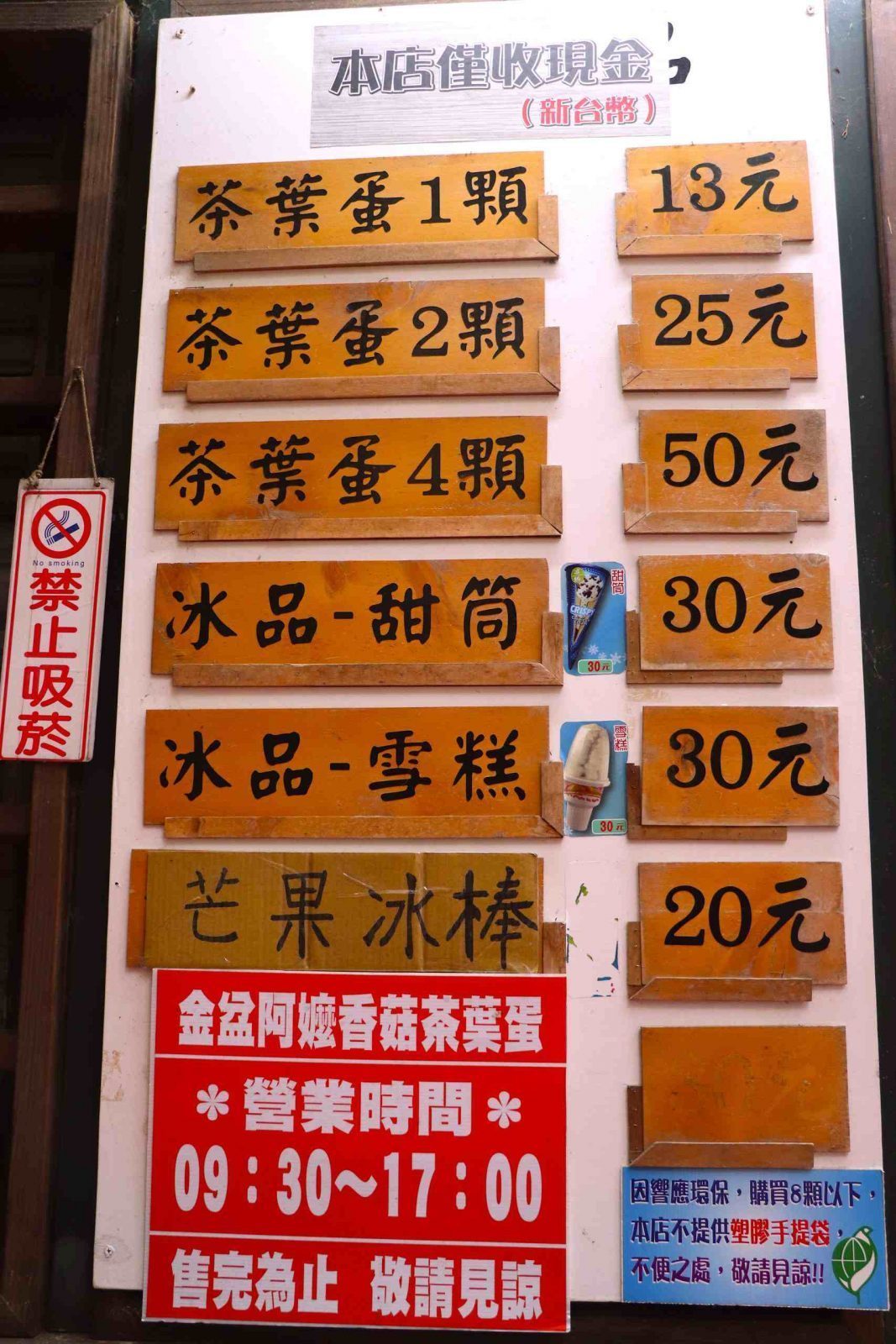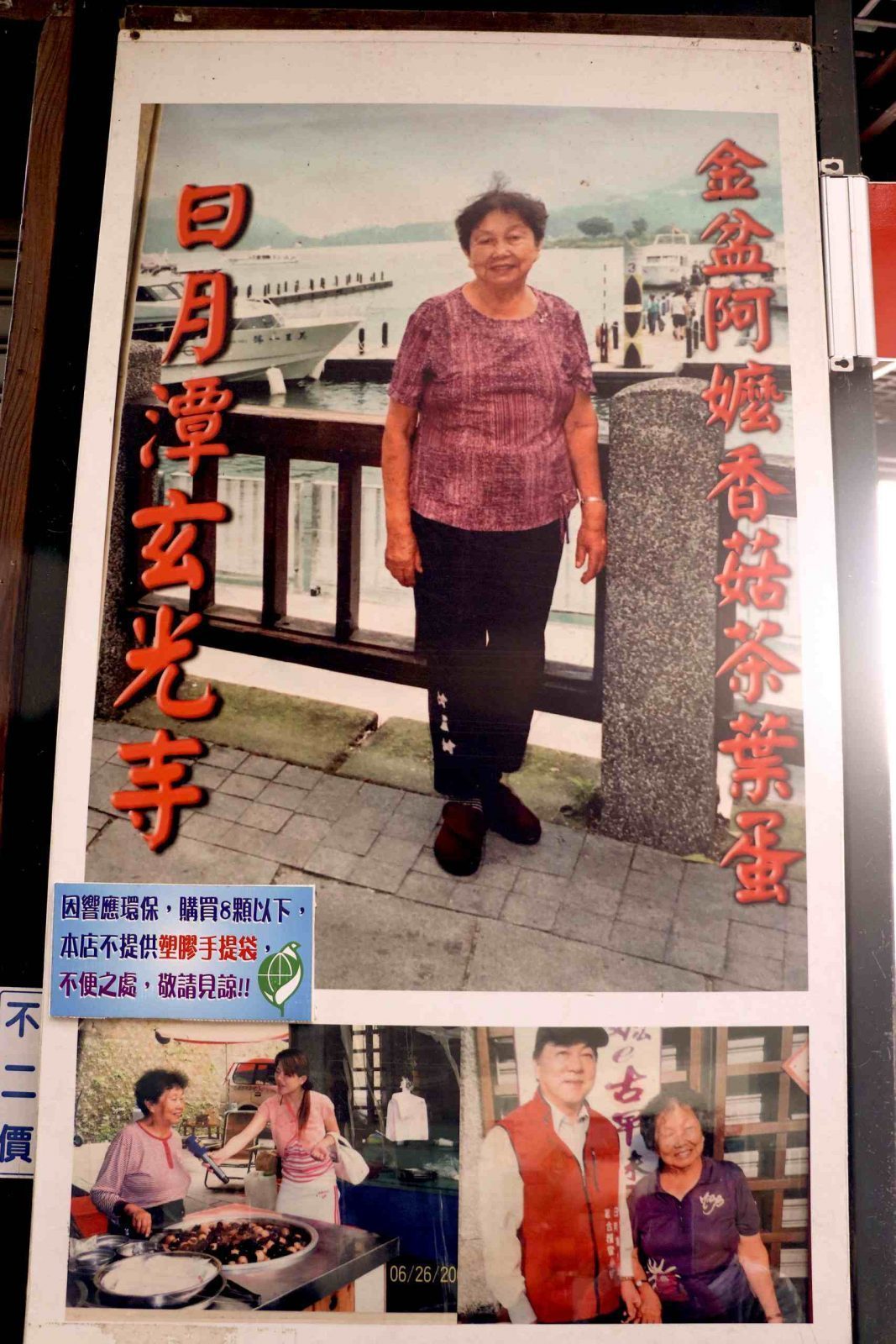 所謂阿婆茶葉蛋,似乎大家的叫法都不同。網路上有人叫他做日月潭茶葉蛋(有些陸客會說茶雞蛋),也有人叫他玄光寺茶葉蛋,其實他的全名應該是「金盆阿嬤的香菇茶葉蛋」。只是多數人都會簡稱為「阿婆茶葉蛋」。