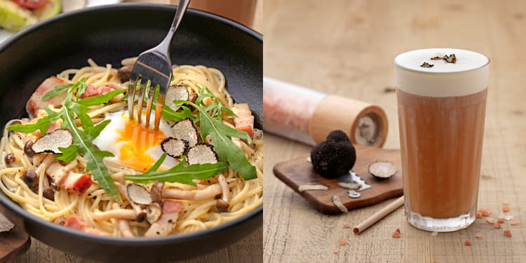 黑松露季當然也少不了與義大利麵結合,BEPPIN PASTA 推出「黑松露溫泉蛋奶油義大利麵」,以自家製奶油醬汁炒製口感彈牙的生義大利麵而成,混在麵條裡的培根肉香、鴻禧菇的甘脆滑順,加上與黑松露最搭配的溫潤溫泉蛋,端上桌時再現刨義大利頂級黑松露,絕對能滿足各位松露控的嘴!另外,這次也將人氣奶蓋紅茶再升級,推出「黑松露奶蓋紅茶」,在奶蓋上刨下黑松露,並點綴粉色的玫瑰鹽,不論色、香、味全都顧到了!