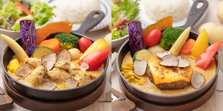 不少老饕心中首選咖哩品牌泰迪農園咖哩則為大家帶來大量松露料理!「黑松露咖哩燉雞」以雞骨、多種水果熬製的鮮美新宿咖哩醬,加上香氣濃郁的松露醬調和,加入久燉不爛,仍能保持纖細肉質的舒康雞燉煮,在大口咬著吸附松露咖哩醬風味的雞肉同時,還能隱隱嗅到黑松露的清新氣息!「黑松露起司漢堡排咖哩」則以新宿咖哩醬與黑松露醬為基底,加入純牛肉手工製作的漢堡排、濃郁炙燒起司片以及現刨黑松露,肉汁飽滿的漢堡排吸附滿滿黑松露咖哩醬的香濃,一口咬下大大滿足!如果還會嘴饞的話,也可加點口感酥脆綿密、可沾黑松露美乃滋的「黑松薯條」喔!