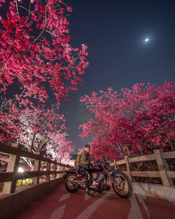有著「全台最美的派出所」名號,后里泰安派出所可不是浪得虛名。位於派出所旁的200公尺長路段,種植近百株的櫻花樹,每到冬末春初的開花季節,都吸引大量人潮湧入,除了日間欣賞粉色紛飛美景外,其實這裡夜間點燈賞櫻才是最高級的隱藏版玩法,微微的燈光打在櫻花花瓣下,搭配著水圳與石製護欄合影,照片就像來到東京目黑川般夢幻浪漫!櫻花枝頭在水面上暗影浮動,少了白天人聲鼎沸的吵雜,反而更能靜心欣賞櫻花的美。