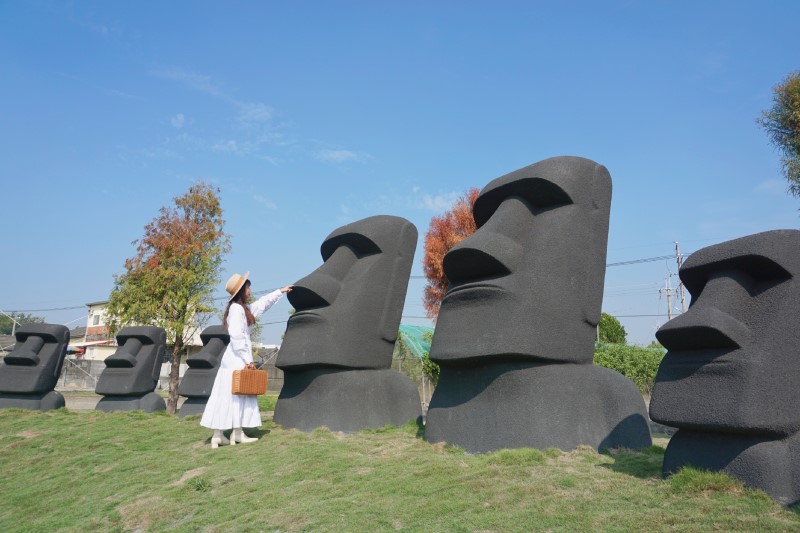 歷經一番的整修「董家花田」有了新樣貌,來到園區除了可以欣賞許多不同品種的花卉之外,園區內還增設了許多藝術裝置,坐在淡雅的鵝黃色天幕下欣賞美景也別有一番風味,另外老闆也把復活島的摩艾石像復刻到園區內,讓園區多了一番異國風情,無法出國的後疫情時期還能來「董家花田」沾染一點出國的氛圍。