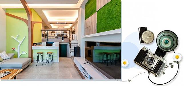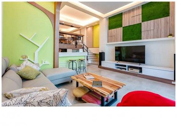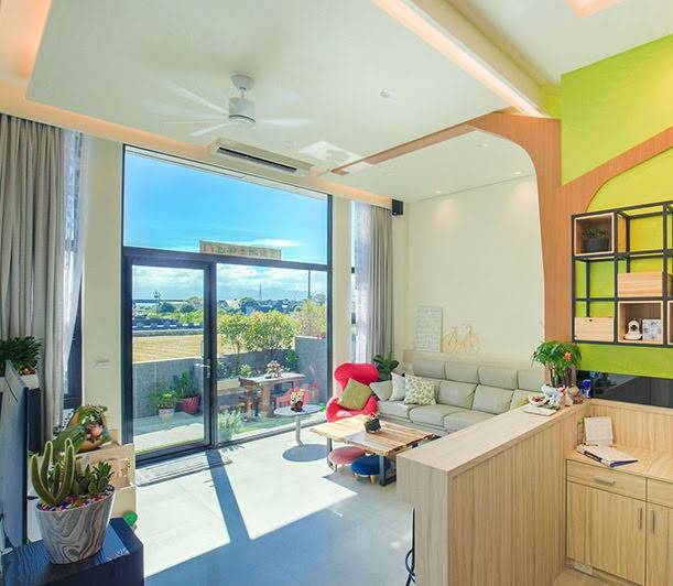 走進五結那旅的客廳,就能看到設計感十分強烈又有活力的綠意牆面,當天氣好的時候,和煦的陽光會從沙發旁的大片落地窗灑進室內,