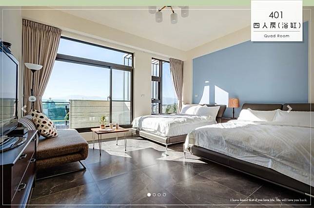另一間四人房擁有大片窗戶,窗外景緻超棒!不管白天晚上,坐在房間內就能欣賞風景,當然走到陽台上景色會更好唷!