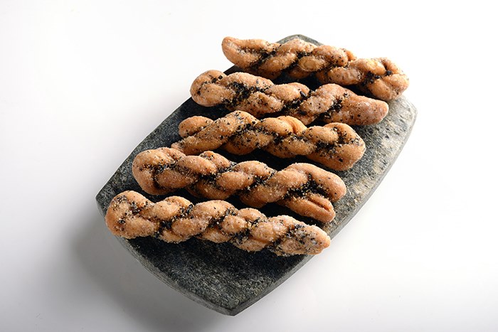 寶哥麻花捲口味非常多,除了常見的芝麻、黑糖之外,還有梅子、草莓等創新口味,鹹的椒鹽和香辣口味也有大量的擁護者。寶哥麻花捲先炸後烤的方式,讓麻花捲有著香酥的口感卻又不會太油,再撒上各種調味粉,每種都來一點也不怕吃膩。另一產品米麻花則使用糙米製作,將營養價值很高的糙米變成好吃的零食。