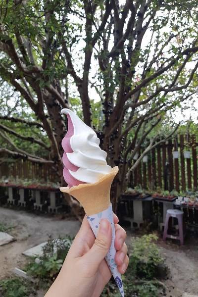 不小心經過就會被夢幻的紫色給吸引住,原來是田尾【庭彩園藝】的新興文青冰品「拾捲」,夢幻紫的霜淇林是以樹葡萄果實連皮帶籽原汁製作直接製作成霜淇淋,酸甜口感在口中綻放開來,帶點樹葡萄獨特的香氣卻不死甜,來訪一定要來品嚐看看!另外老闆也有釀了樹葡萄酒,比一般的葡萄酒濃度再更濃一點,而且入喉後不會感到酸澀或死甜,也很值得嘗試。