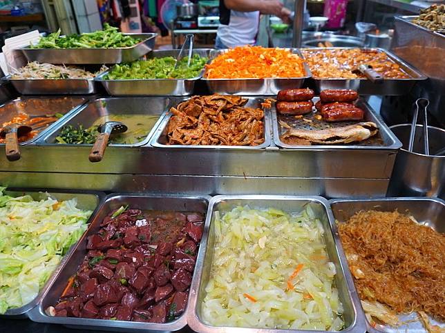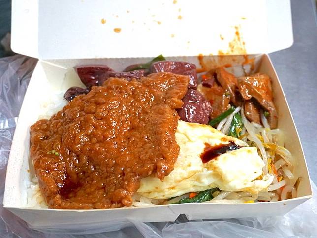 位在轉角處的【台北小吃排骨飯】除了可以在店內用餐外,大多數人都會到這裡包便當。便當可以選擇四樣小菜+一樣主菜(排骨、爌肉、香腸、煎魚)只要50元銅板價。