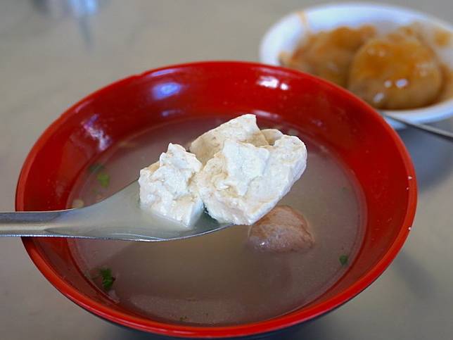 ▲必喝的傳統「綜合湯」 $25,裡頭有兩顆貢丸與不少豆腐,湯頭喝起來濃郁清香讓人不知不覺就把整碗湯都喝光光!