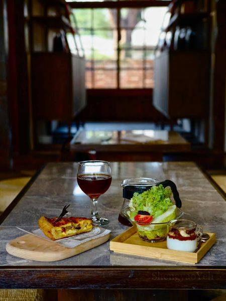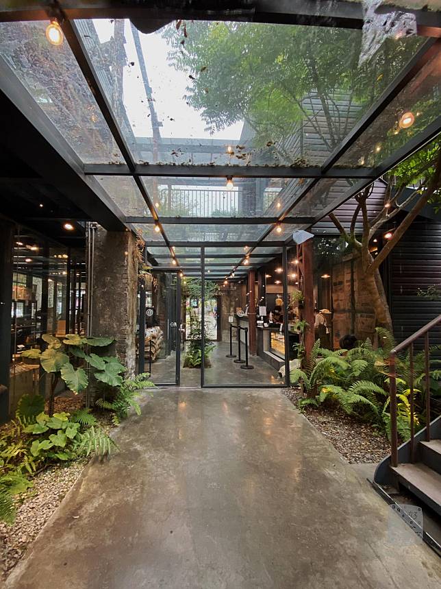 這裡是由碾米廠改建成而成的咖啡館,半裸露的磚牆裡頭有著植栽綠意,加上大片玻璃圍起、覆蓋,就成了一間獨特的玻璃屋咖啡館。午後,西斜陽光與植物的光合作用,我也搭著咖啡的香、糕點的甜,倘佯在這彷彿與外隔絕的空間中。