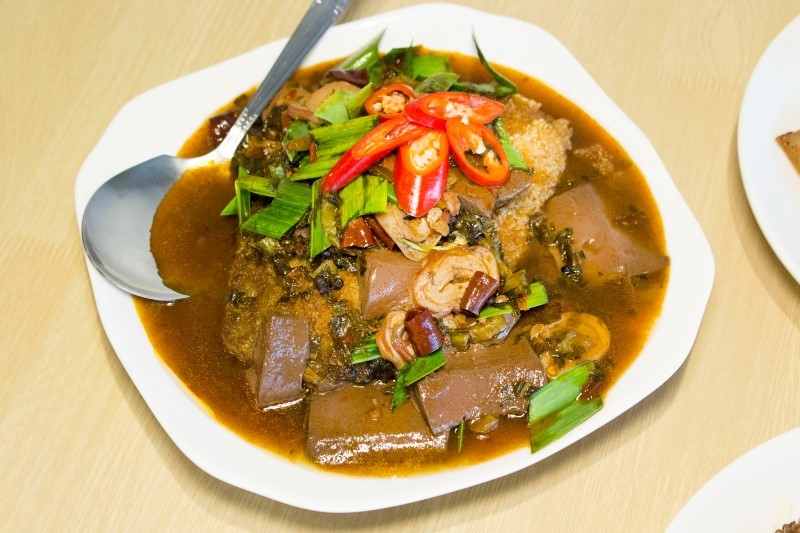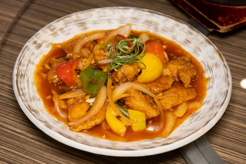 位於台東美食一級戰區內【聚飽朋平價熱炒】,老闆傳承爸爸的好手藝並且改良創新,研發出多樣獨特的創意家常料理,店內獨家研發「五更腸旺比目魚」更是必點的餐點,將高溫油炸的鮮嫩比目魚淋上豬大腸、豬血,搭配濃醇的特調醬汁,辛辣過癮讓人一再回味。