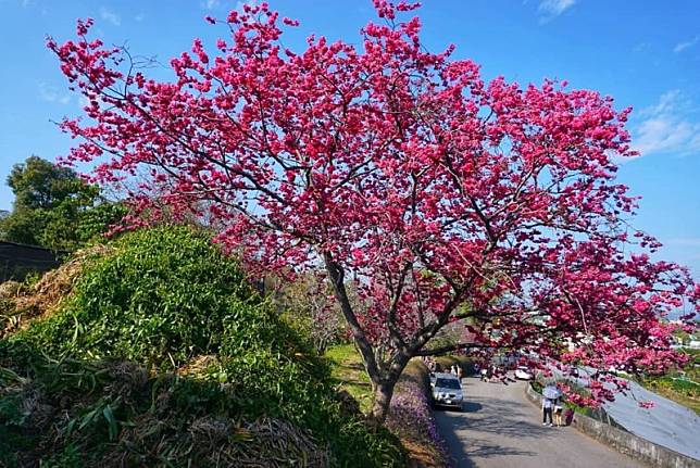 新社區的櫻花不但是台中民眾踏青勝地,更是中部的朋友每年必到訪的賞花景點,沿著市道緩緩而行,路邊櫻花已悄悄盛開,浪漫的櫻木花道吸引不少民眾駐足拍照,這裡的櫻花林不僅密集度高,櫻花品種也很多元,八重櫻、富士櫻、牡丹櫻、香水櫻花等不同顏色的櫻花接力綻放,構成一幅幅美麗的畫作,讓人流連忘返。