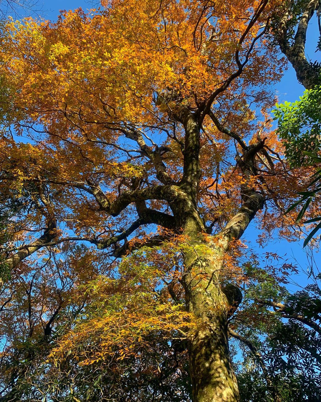 過了回音谷山勢出現下坡,抵達1.6K的環形步道的叉路口後出現兩岔路,兩條路都可抵達北得拉曼山的神木群,接著會看到內鳥嘴山和神木的指標。體力與時間許可的山友可以先繞行至內鳥嘴山再續行前去看神木,在每年十一月中到月底能看到台灣原生種山毛櫸由綠轉黃。這種樹種集中於桃園、新竹、宜蘭山區,並不是特別常見的樹種,在秋季看到換上金衣的山毛櫸是非常難能可貴的經驗。
