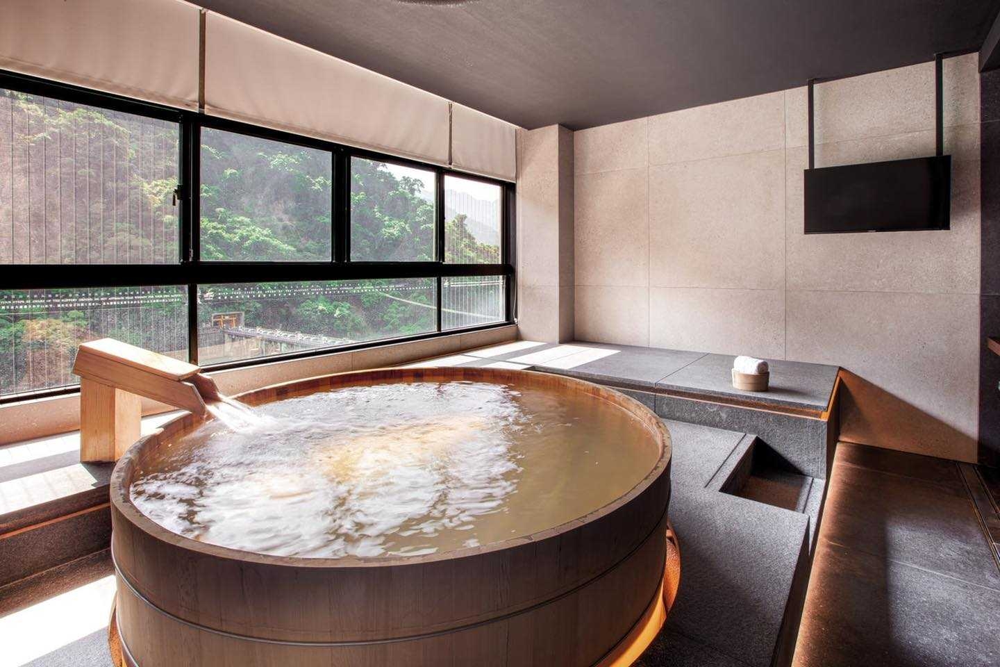 烏來國際岩湯位於烏來老街上,對於搭乘大眾運輸來烏來泡湯的旅客而言是相當方便的選擇。景觀湯屋內有一大一小的冷熱池、乾濕分離的浴室,木質調的室內設計也十分符合泡湯的溫潤氛圍。溫泉池旁的捲簾能自行調整,立刻變身半露天式的私人湯屋,在房內即可遠眺烏來美景。