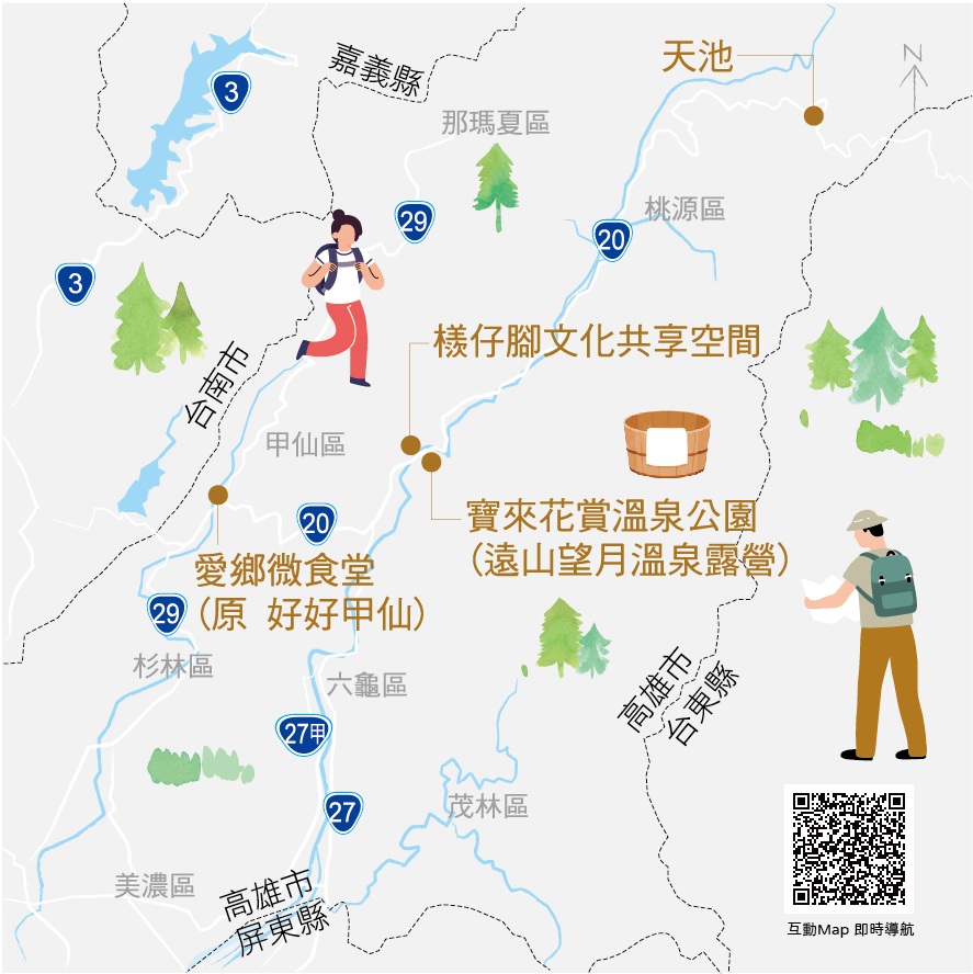 從甲仙、六龜出發,深入高雄茂林、桃源,茂密原始林展現旺盛生機,紫斑蝶在花叢間翩翩起舞,隱身山中的秘境溫泉彷彿等待旅人打開的藏寶箱,稍走點路、多呼吸些芬多精,最後在眼前出現的天然絕景,讓人大感不虛此行。