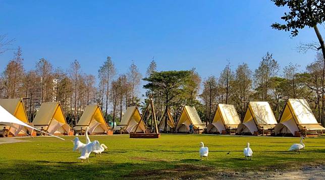淨園農場是一個複合式的農場,除了可以看飛機起降、吃南洋美食、餵食可愛動物、親子共乘小火車,還有網美最愛的落羽松之星空帳篷,這裡擁有並排的雅緻白色帳蓬,周圍還有落羽松環繞,假日時親子還可以在草地上悠閒野餐,每到夜幕低垂,營火會冉冉生起再搭配上柔和的音樂,可以與朋友擁有一個不一樣的夜晚。