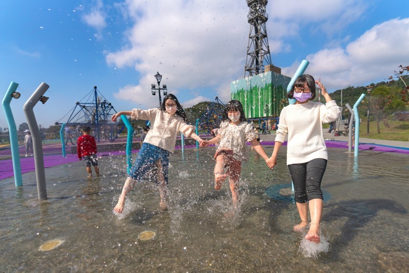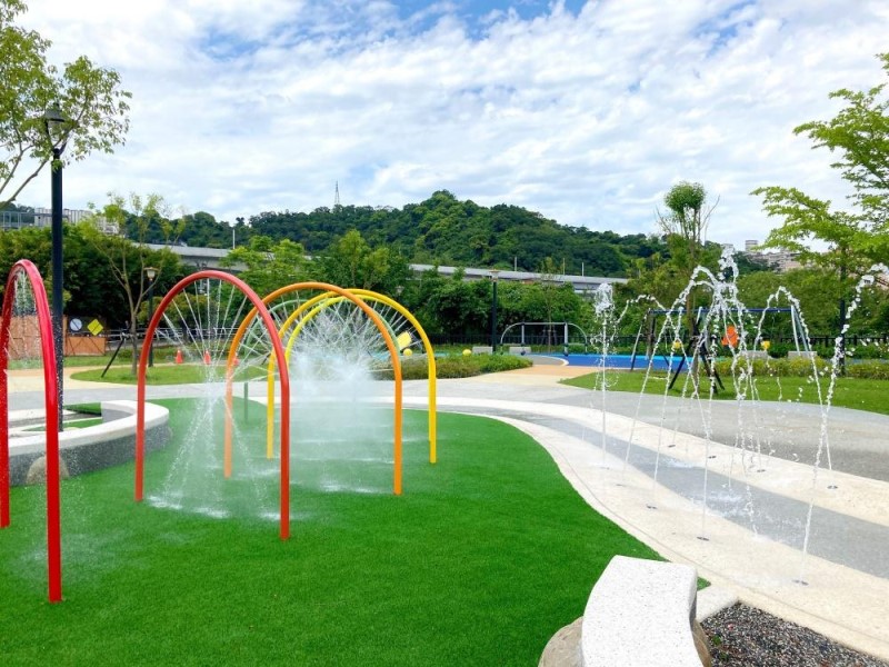 由新北市政府打造的水陸空三棲特色遊戲場──新店陽光運動園區,以全新面貌重新亮相,重新規劃的兒童遊戲區將新店溪溪流意象融入,設計成蝶型水道,每30分鐘噴水15分鐘,提供友善無障礙路徑串聯水霧、落瀑水盤、噴泉、淋水道、花灑、幫浦、水閘門、綠丘湧泉及戲水潭等,讓孩子們一次暢玩9種不同戲水設施。