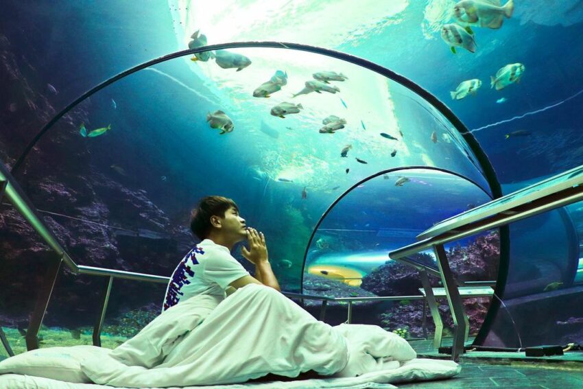 屏東海生館還有一個特別的體驗活動,那就是夜宿海生館!兩天一夜的夜宿體驗,最熱門的地點是海底隧道、白鯨區、極地區、海藻森林,能和海洋生物一起睡覺,晚上的海生館會看到一些夜行性魚群出沒,也能看到魚怎麼睡覺的樣子,是白天看不到的景象,到白鯨區還會有值班的白鯨陪著你度過夜晚,伴隨著平緩安靜的水聲入睡,一早醒來就能欣賞無數的魚兒悠游,是很特別的一個體驗。除了睡覺之外,還有很多夜宿限定的活動可以參加,像是進入到展示缸的後台、大洋池餵食秀等,都是夜宿海生館可以體驗的有趣活動。