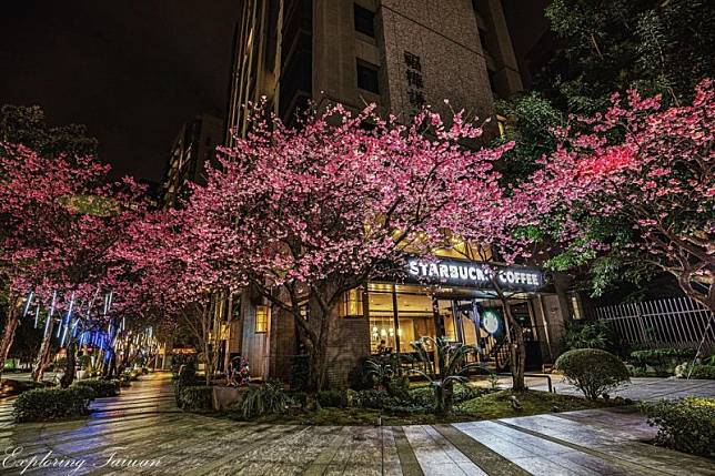 位於林口三井OUTLET附近的星巴克林口文化三門市外種植了好幾株櫻花樹,每到2月初總是會成為來往民眾注目的焦點,粉嫩的櫻花樹海隨風飄逸,可以說是最有櫻花味的星巴克,不僅讓你身處櫻花包圍的浪漫氣氛下,享受愜意的咖啡下午茶,到了夜晚時分在燈光映照下的櫻花樹更顯艷麗,難怪可以得到「林口最美星巴克」的稱號。