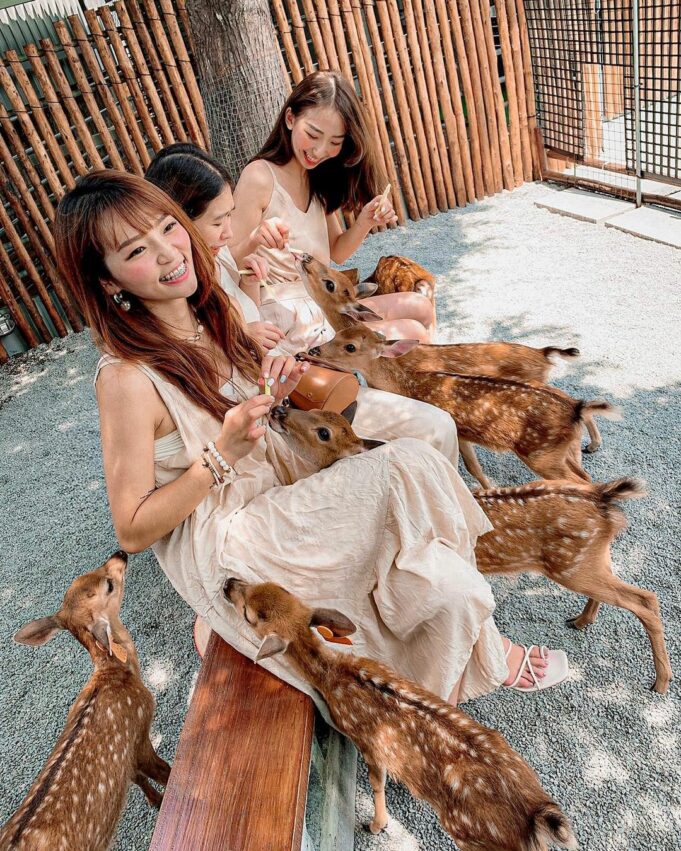 張美阿嬤農場園區空間相當大,分成室外的梅花鹿區、DIY體驗區,還有下雨時的梅花鹿雨天餵食區,園區造景以日式庭院為主題,紅色鳥居、白色矮木屋讓遊客走在園區內有如身處日本,也是熱門的IG網美打卡勝地。