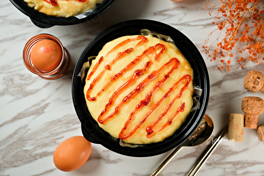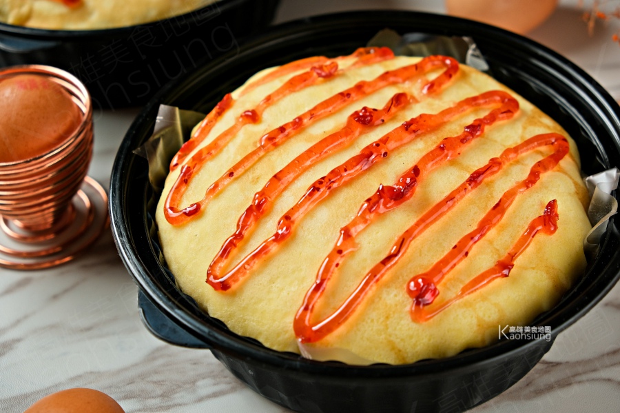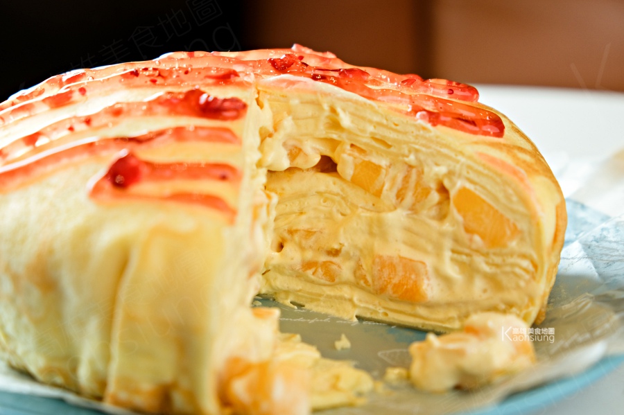 什麼蛋包飯,其實它是芒果千層蛋糕啦!將岩燒蛋皮層層堆疊、層層塗抹芒果卡士達,中間還夾入2層新鮮金煌芒果丁,最上層的偽番茄醬是蔓越莓醬,整個看起來像吧!造型這麼美,當生日蛋糕貨也很適合。