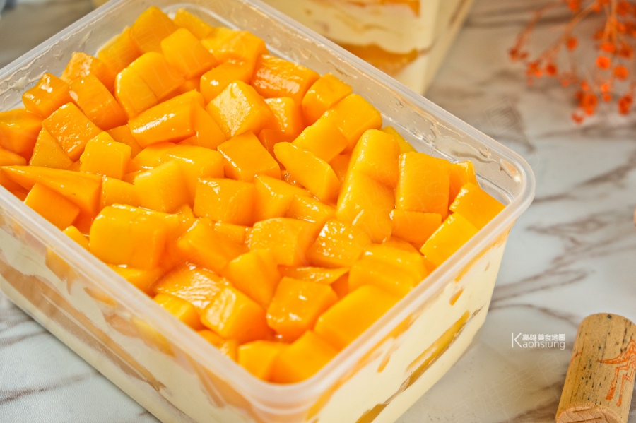 給它爽快的挖下去吧!芒果丼飯除了超多的新鮮金煌芒果之外,主體是鬆軟的戚風蛋糕,還有消化餅乾增加口感,提升濃郁風味的義式乳酪,以及分量十足大爆滿的芒果卡士達醬,把全部一切食材都巧妙融合在一塊。