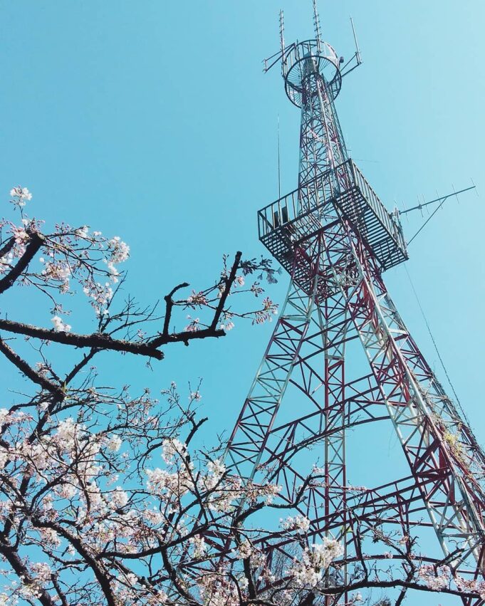 從另一個角度由下往上觀望,一旁的紅白無線電塔穿梭在櫻花之間,頓時之間有種櫻花配上縮小版東京鐵塔的異國景象,另一邊還有機會拍到阿里山小火車呼嘯而過時,與櫻花共譜的夢幻畫面喔!