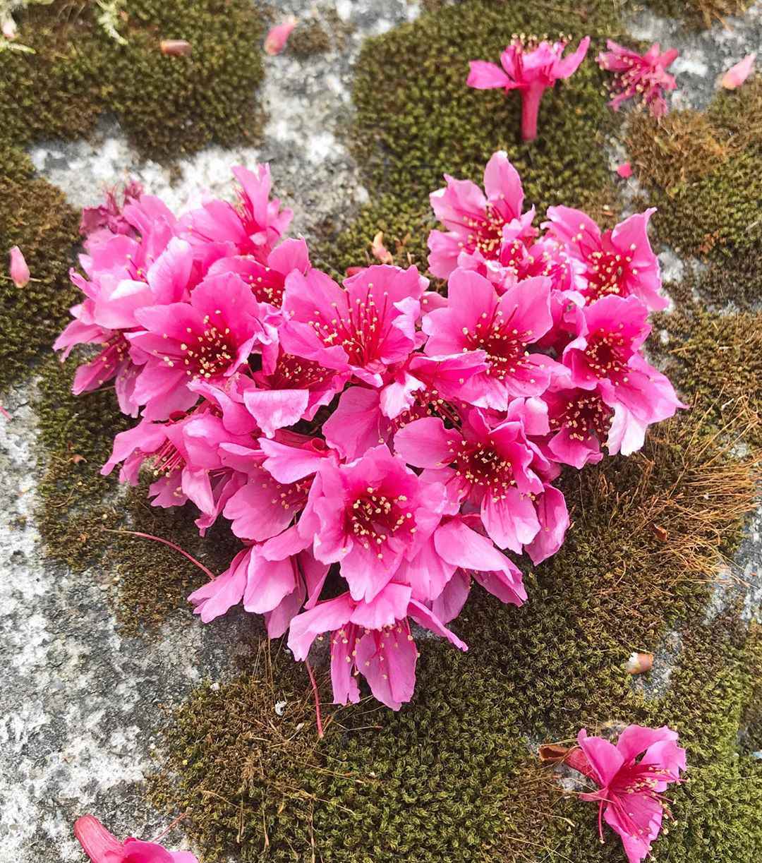 ▼阿里山櫻花盛開,旅客將櫻花排成愛心形狀