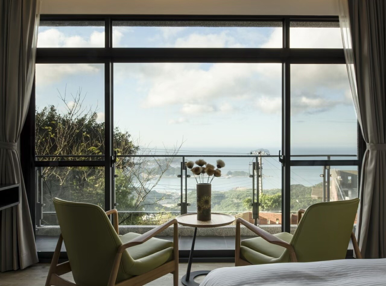 乾淨寬敞的民宿空間,大片窗外便是山嵐繚繞與正藍海景!