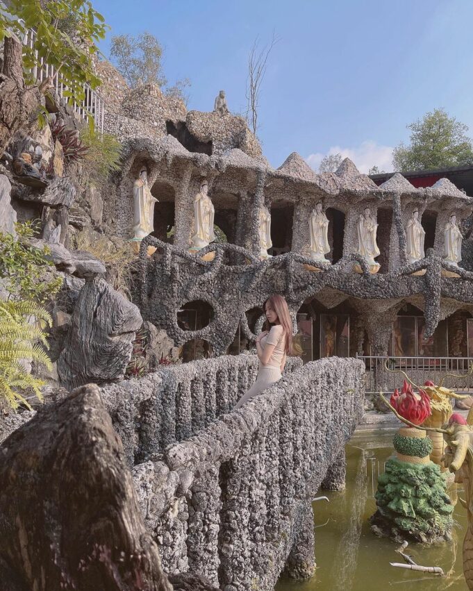 有別於一般建築是用磚、瓦、鋼筋、水泥等建材,田寮慈玄聖天宮是用石頭與貝殼所建立出來的。背後的原因是當初受廟方救濟的泰籍移工為了表達感謝之意,依照佛祖的指示與過往建設的經驗,一手一石建造出來,作工十分精細,寺廟內的石橋、石柱、石梯…每個區域都令人嘆為觀止,彷彿在觀賞藝術品。