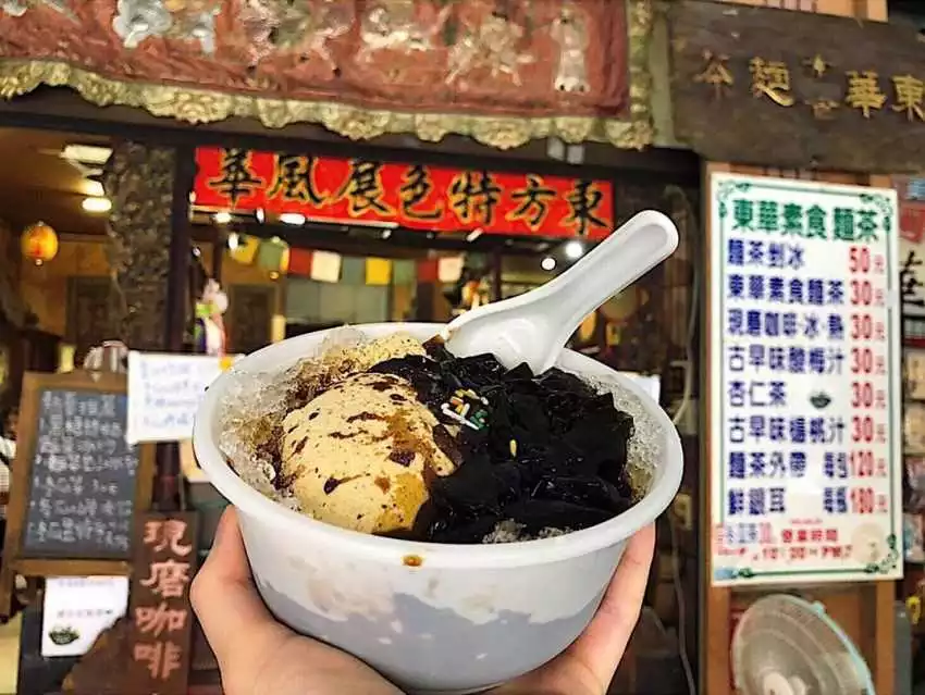 這間「東華素食麵茶」是平常比較少能吃到的古早味甜品。吃過這家麵茶的朋友都說他們的麵茶味道單純,吃得到麵茶香和芝麻香,沒有其他添加物吃得很安心。遵循古法製作外也不忘創新,例如麵茶冰沙、麵茶剉冰就是廣受好評的創新冰品,剉冰上有黑糖漿汁,再加入麵茶粉、仙草等,分開吃或攪拌在一起都別有一番滋味,不想吃料的朋友則可以選擇麵茶冰沙,真材實料又不甜膩。