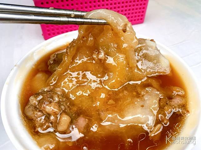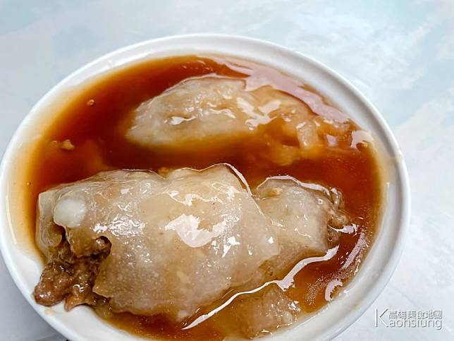 肉圓的皮較厚,吃起來相對偏軟。搭配濕潤醬汁很好入口、口感有醬油的甜香。