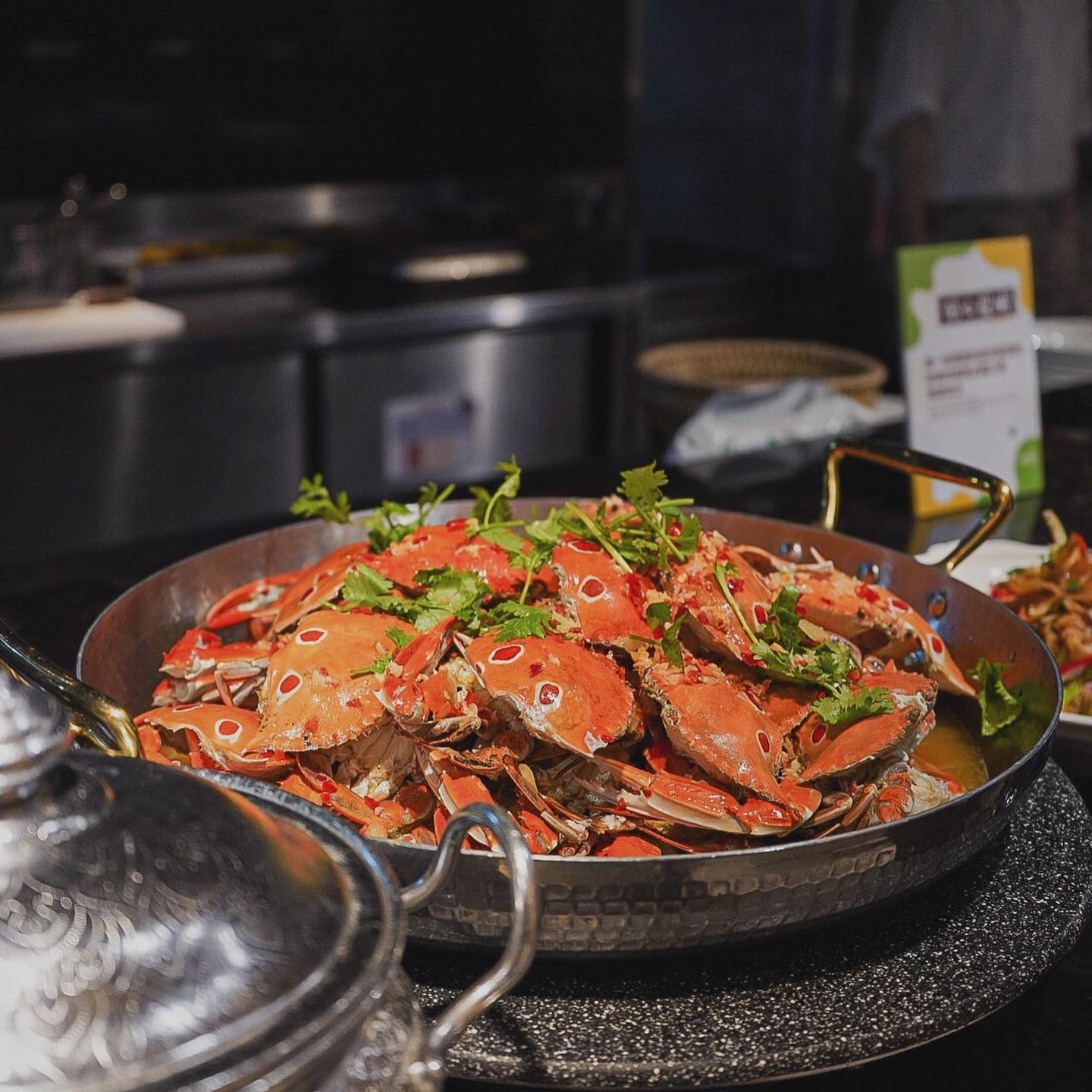 台北遠東香格里拉飯店旗下的遠東Café自助餐廳,9/2-10/30 推出期間限定的「品蟹嘉年華」,想大啖秋蟹就趁現在!餐廳主廚黃仁人嚴選東北漁港新鮮直送的當季活鮮,在原本就很豐富的「精選海鮮吧」餐檯上,新添旭蟹、三點蟹、佐渡花蟹等肥美多汁的蟹種;同時結合多國料理精華,推出鍋炒避風塘螃蟹、新加坡辣椒蟹、奶油焗烤甲羅燒等十道異國美饌,將中、西、日及南洋風味一次融燴,宛如來到超大型美食樂園。如果你和小編一樣,吃完上述美食仍覺得不過癮,加價728+10%元還能加點三款搭配特製沾醬的「沙公三味」,深度滿足只想嚐蟹的渴望~