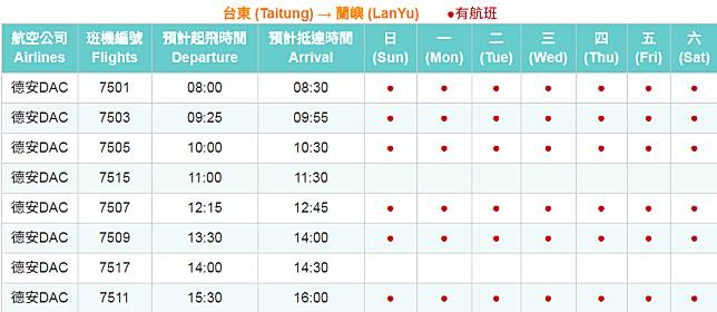 ▲台東-蘭嶼航班資訊。(圖/台東航空站)
