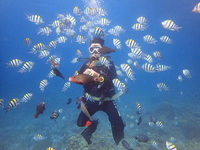 而且這段海岸屬於礁岩平台地形,海域變化層次多,因此有大片的石珊瑚景觀,以及各式各樣小個體的熱帶魚群,在生態允許的限度下與牠們共遊,是非常難得且更能深度探索綠島旅遊景點的玩法。
