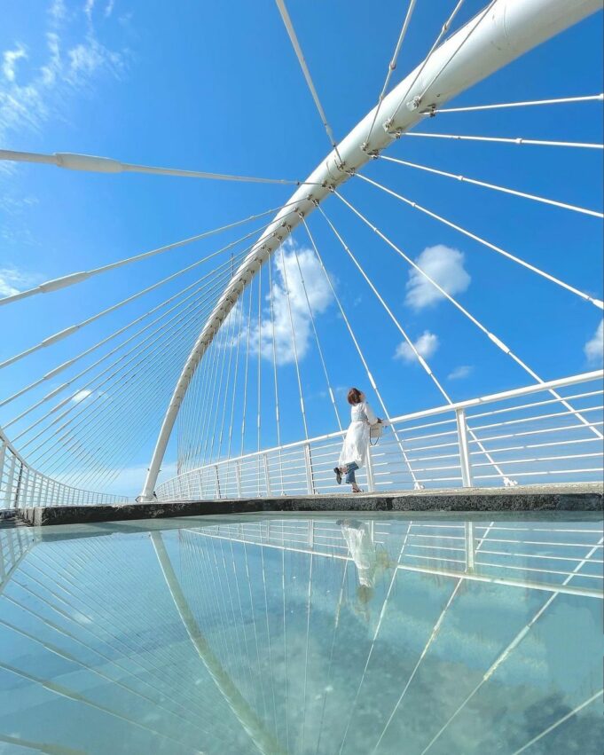 新竹的河畔IG打卡熱點除了頭前溪的「豆腐岩」以外,南寮漁港岸邊還有一處「魚鱗天梯 」,取代傳統一成不變的消波塊形狀,使用魚鱗狀的階梯式造型作為防波海岸,不但具有原本的防洪功能,且還兼具安全、休憩、美觀,讓民眾可以更接近海面,也是來新竹必拍的一處打卡點。