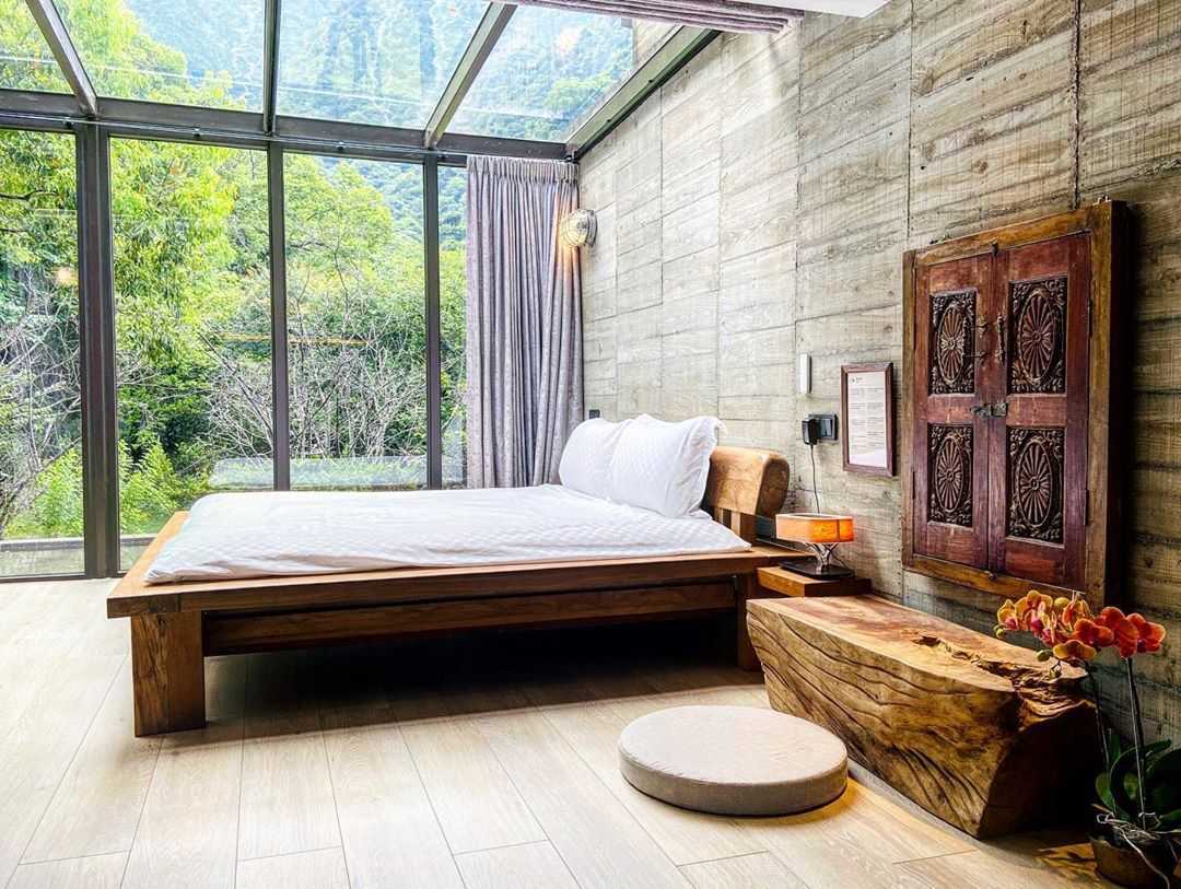 「迴音谷森林民宿」追求更明亮的採光以及開放透視感,在有限的垂直牆面裡特別採用了前傾15度的玻璃帷幕,提供房內往外窗望出更寬敞舒適的視覺效果。睡在佇立於森林裡的玻璃屋房間,就像是住在秘境森林之中,讓旅人透過視覺與嗅覺徹底體驗放鬆身心靈的森林假期。