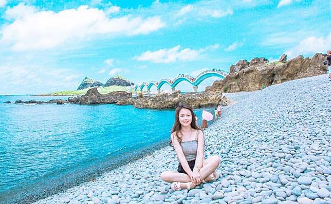 礫灘也是三仙台的海蝕地形之一,圓潤小巧的一顆顆小石頭,平鋪在八拱橋的一側,坐在礫灘上吹著海風,欣賞海天一色的風景,真是無比舒服暢快。