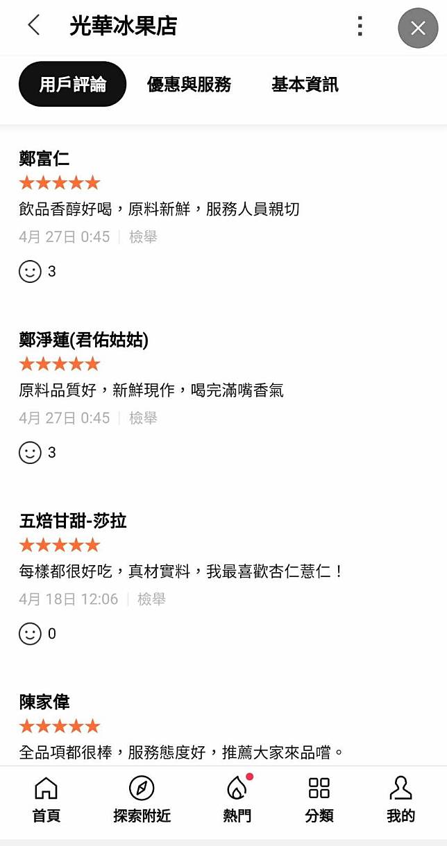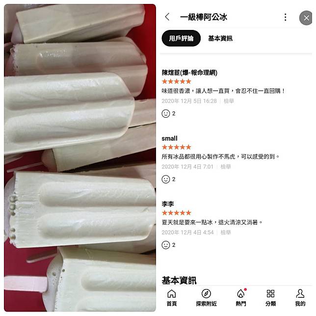 圖片來源/一級棒阿公冰好的甜品讓你上天堂,吃到好吃的甜點,是不是想開心地大叫、忍不住很想告訴別人呢?快來聽聽別的吃貨怎麼說,也一起來留評論喔!📍品安豆花 (看地圖) 素美:“甜點種類很多,豆花綿密好吃,價格合理贊贊👍“📍光華冰菓店 (看地圖) 五焙甘甜-莎拉:*“每樣都很好吃,真材實料,我最喜歡杏仁薏仁。” *📍一級棒阿公冰 (看地圖) 陳煊茞:*“味道很很香濃,讓人想一直買“ *small:“所有冰品都很用心製作不馬虎“📌快分享你的評論讓更多人知道>>● 熱門夯話題︱更多精彩的吃喝玩樂情報都在這>>