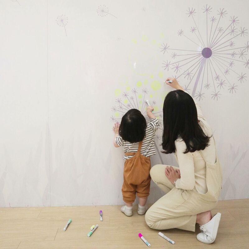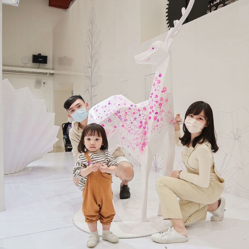 想知道自己製作的漸層彩色筆畫出來到底是什麼顏色嗎?那就到隔壁的創意體驗區彩繪吧!在家裡總是很怕小朋友拿著蠟筆或彩色筆畫牆壁、畫桌子、畫地板,而這裡有各式各樣不同的白色立體摺紙動物,只要是看的到的地方通通都能塗鴉畫畫,是個可以盡情揮灑的空間。