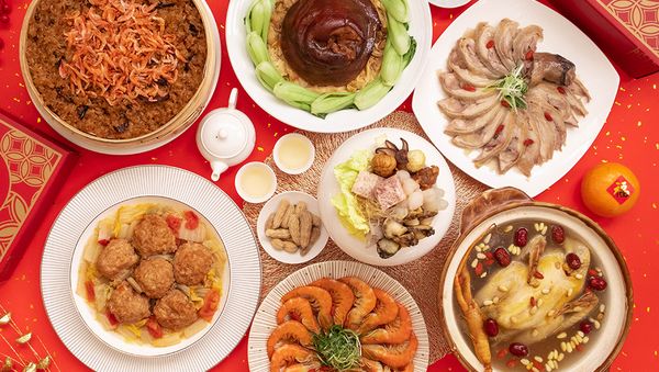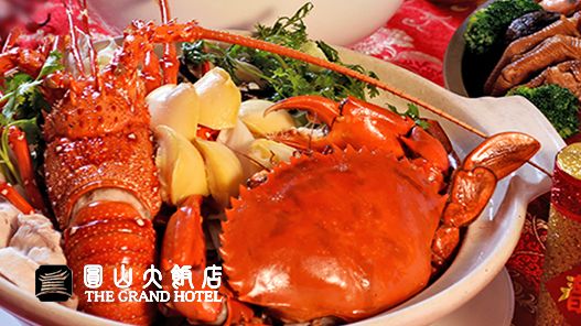 寒舍艾美迎新春、松茸元貝花膠一品佛跳牆、川味海皇醬汁干燒龍蝦、低烹燒烤聖路易排佐輕蔬、京醬蔥油鮮露蒸龍虎斑、主廚特製海陸脆米拌飯、玫瑰荔枝奶皇包 NT9,999 (適合6人份)