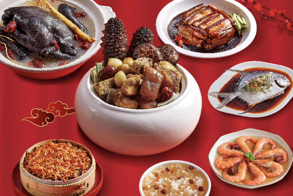 迎春五福美拼皿、紅燒魚翅海鮮羹、蒜茸蒸開邊龍蝦、五彩糖醋黃金鯧、富貴蓮貞香蹄膀、蒲鰻干貝蒸米糕、人蔘棗皇燉全雞、新年全家福蛋糕
