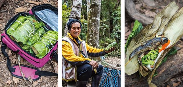 由早期泰雅族獵人、現任霞客羅古道解說員鍾風光之妻製作的獵人便當,新鮮的苦花魚搭配山豬肉,結合糯米一同包覆於芭蕉葉內,香氣十足,是只有來到霞喀羅古道預約才吃得到的天然山產。